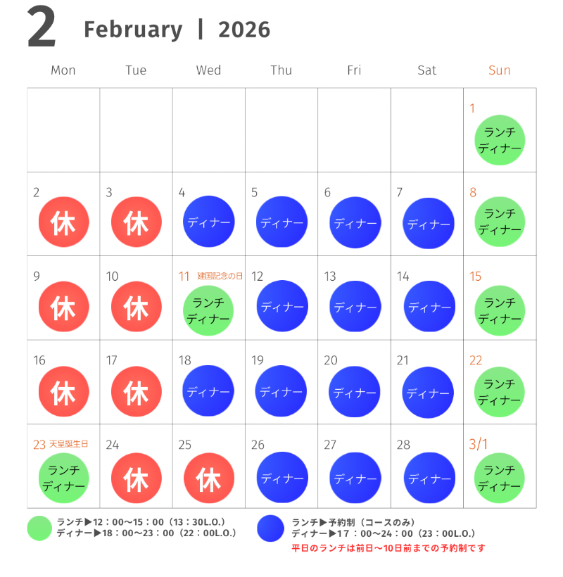 ●水曜〜金曜▶12:00~15:00(前日15時までの完全予約制)/18:00~24:00閉店