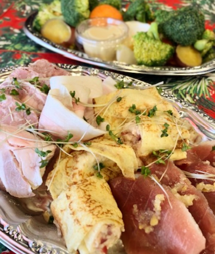 お肉、魚、野菜の前菜をバランスよく盛り込みます