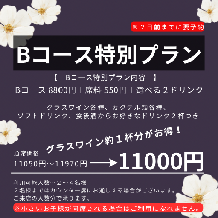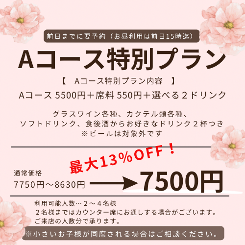 グラスワイン各種、カクテル各種、ノンアルコールドリンク各種、食後酒各種からお好きなお飲み物をそれぞれお選びください。Aコースはランチタイムもご利用できます。※各コースの詳細は、ランチ、ディナーのページをそれぞれご覧ください。